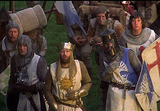 Prof Arthur and his RAs, along with their servants, "ride" up to a castle. Prof Arthur's administrator, Patsy, blows a horn.